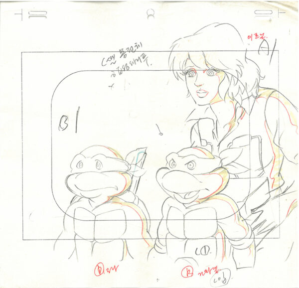 4 original Teenage Mutant Ninja Turtle production drawings. These drawings depict frames from a scene in a Teenage Mutant Ninja Turtles cartoon episode. These frames feature April, Raphael and Donatello. Produced by Murakami-Wolf-Swenson Studios, 1987. Presented sleeved with a Certificate of Authenticity by Classic Moments. Production Notes. 10×11 Drawings originally stored folded. #64