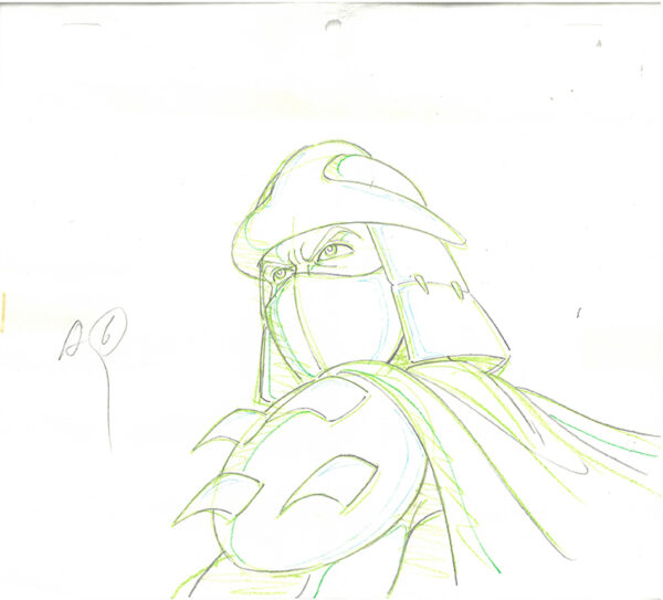 3 original Teenage Mutant Ninja Turtle production drawings. These drawings depict frames from a scene in a Teenage Mutant Ninja Turtles cartoon episode. These frames features Shredder. Produced by Murakami-Wolf-Swenson Studios, 1987. Presented sleeved with a Certificate of Authenticity by Classic Moments. Production Notes. 10×11