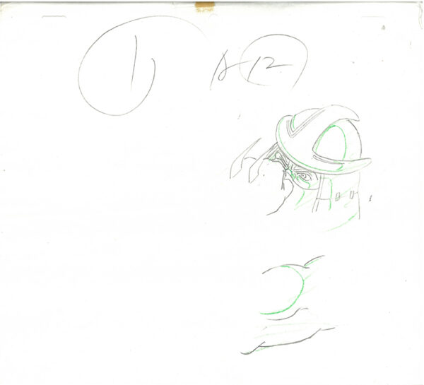 3 original Teenage Mutant Ninja Turtle production drawings. These drawings depict frames from a scene in a Teenage Mutant Ninja Turtles cartoon episode. These frames features Shredder. Produced by Murakami-Wolf-Swenson Studios, 1987. Presented sleeved with a Certificate of Authenticity by Classic Moments. Production Notes. 10×11