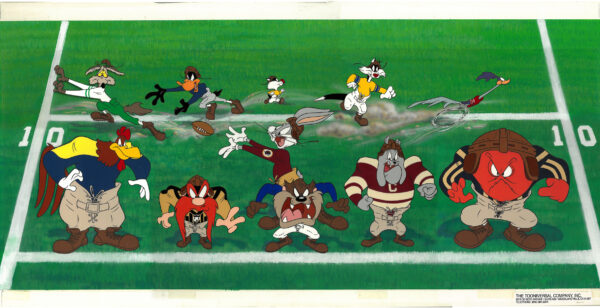This hand-painted prototype cel with MASTER hand-painted background is entitled “3 Yards and a Cloud of Dust.” It features eleven characters from Wile E. Coyote to Gossamar wearing football uniforms of different eras. They stand on a lush, green field surrounded by the helmets of 30 different football teams. The original drawing was created by Warner Bros. in association with Robert McKimson Productions. Robert McKimson, longtime major creative force during cartooning’s “Golden Age” at Warner Bros. Licensed -NHL/WB Measures 15 x 34 and is presented with a COA. Ships flat.
