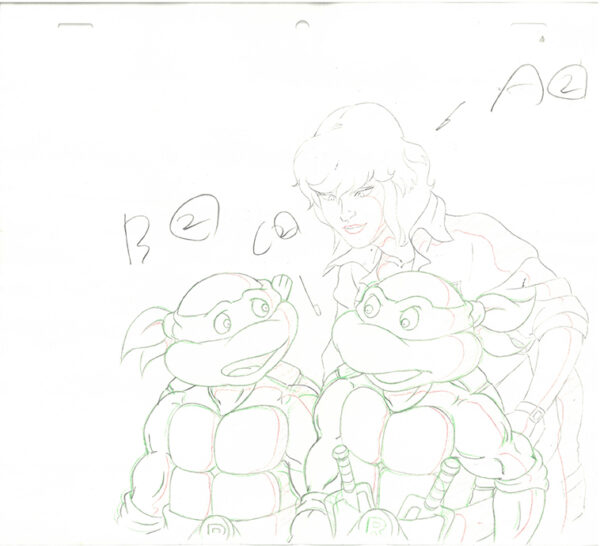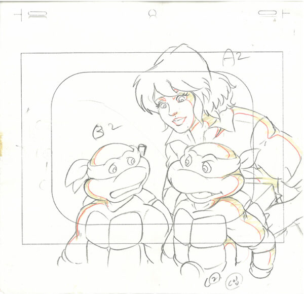 4 original Teenage Mutant Ninja Turtle production drawings. These drawings depict frames from a scene in a Teenage Mutant Ninja Turtles cartoon episode. These frames features April, Raphael & Donatello. Produced by Murakami-Wolf-Swenson Studios, 1987. Presented sleeved with a Certificate of Authenticity by Classic Moments. Production Notes. 10×11