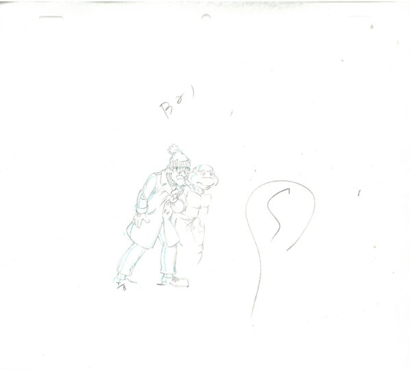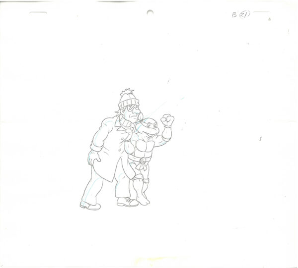 An original Teenage Mutant Ninja Turtle production drawing. This drawing was used for a frame from a scene in a Teenage Mutant Ninja Turtles cartoon episode. This frame features 3 Turtles and Casey Jones. Is produced by Murakami-Wolf-Swenson Studios, 1987. Includes a Certificate of Authenticity by Classic Moments. 12.5×10.5 Bears the MWS seal.