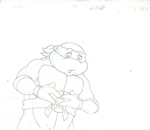4 original Teenage Mutant Ninja Turtle production drawings. These drawings depict frames from a scene in a Teenage Mutant Ninja Turtles cartoon episode. These frames features Raphael, Leonardo, Michelangelo & Donatello. Produced by Murakami-Wolf-Swenson Studios, 1987. Presented sleeved with a Certificate of Authenticity by Classic Moments. Production Notes. 10×11