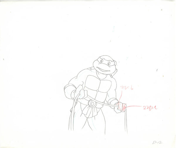 An original Teenage Mutant Ninja Turtle production drawing. This drawing was used for a frame from a scene in a Teenage Mutant Ninja Turtles cartoon episode. This frame features 3 Turtles and Casey Jones. Is produced by Murakami-Wolf-Swenson Studios, 1987. Includes a Certificate of Authenticity by Classic Moments. 12.5×10.5 Bears the MWS seal.