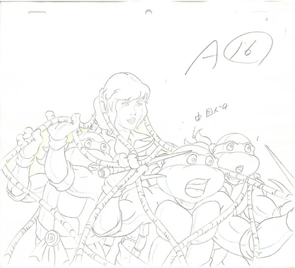 4 original Teenage Mutant Ninja Turtle production drawings. These drawings depict frames from a scene in a Teenage Mutant Ninja Turtles cartoon episode. These frames features April, Raphael & Donatello. Produced by Murakami-Wolf-Swenson Studios, 1987. Presented sleeved with a Certificate of Authenticity by Classic Moments. Production Notes. 10×11