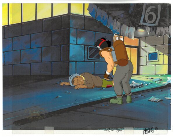 An original Teenage Mutant Ninja Turtle multi-cel production set-up with matching drawing and the MWS Seal. This cel depicts a frame from a scene in a Teenage Mutant Ninja Turtles cartoon episode. This frame features Casey Jones. Is produced by Murakami-Wolf-Swenson Studios, 1987. The background of the cel is a color lithograph and includes a Certificate of Authenticity by Classic Moments. 12.5×10.5
