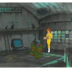 An original Teenage Mutant Ninja Turtle production cel. This cel depicts a frame from a scene in a Teenage Mutant Ninja Turtles cartoon episode. This frame features Donatello. Is produced by Murakami-Wolf-Swenson Studios, 1987. The background of the cel is a color reproduction print, and includes a Certificate of Authenticity by Classic Moments. 12.5×10.5