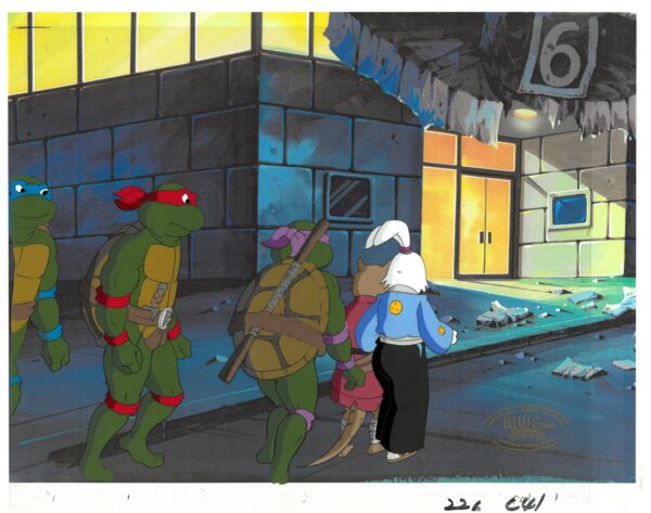 An original Teenage Mutant Ninja Turtle production cel. This cel depicts a frame from a scene in a Teenage Mutant Ninja Turtles cartoon episode. This frame features Donatello, Raphael, Leonardo, Splinter and Miyamoto Usagi. Is produced by Murakami-Wolf-Swenson Studios, 1987. The background of the cel is a color reproduction print, and includes a Certificate of Authenticity by Classic Moments. 12.5×10.5