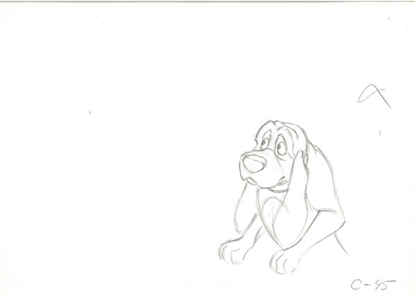 2 Original Production Drawings of Copper from the 1981 Walt Disney movie “The Fox and the Hound.” The movie tells the story of the unlikely friendship between the Fox (Tod) and the Hound (Copper) as they grow up to realize they are supposed to be enemies. Tod voiced by Mickey Rooney and Copper voiced by Kurt Russell. Production notes present on both drawings. 12.5 x 15.5