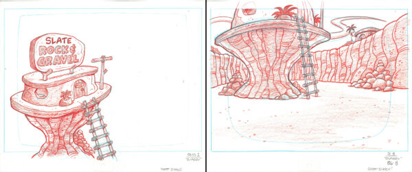 2 original production drawings of The Quarry. These were used in the Hanna-Barbera TV Commercials “Flintstones Fruity Pebbles” episode Quarry, which aired in the 1980’s. They were produced by Playhouse Pictures Hollywood and created by cartoonist and animator Scott Shaw. Playhouse Pictures, founded in the 1950’s produced many well-known animation commercials, promotions and TV Openings, such as Hee-Haw, Rice Krispies, and Playboy. Includes COA. Each of these drawings by animator Scott Shaw. Production notes present on bottom of each drawing.