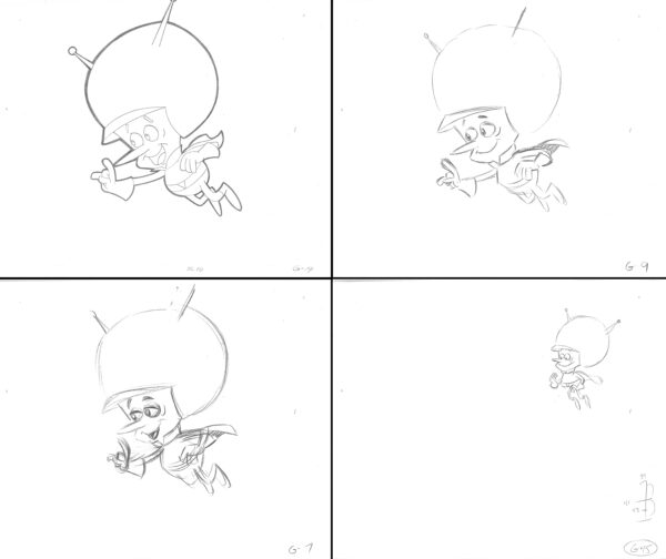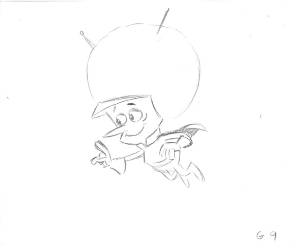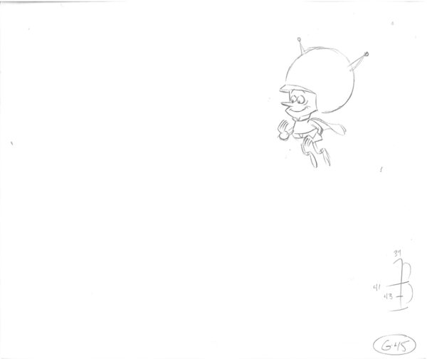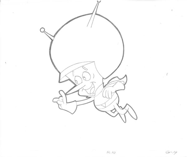 4 original production drawings of Gazoo. These were used in the Hanna-Barbera TV Commercials “Flintstones Fruity Pebbles,” which aired in the 1980’s. Produced by Playhouse Pictures Hollywood, created by cartoonist and animator Scott Shaw. Playhouse Pictures, founded in the 1950’s produced many well-known animation commercials, promotions and TV Openings, such as Hee-Haw, Rice Krispies, and Playboy. Includes COA
