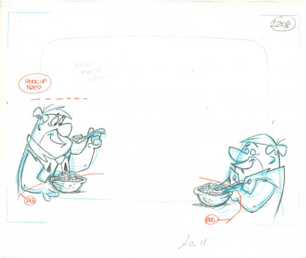 An original production drawing of Barney Rubble and Fred Flintstone. It was used in the Hanna-Barbera TV Commercials “Flintstones Fruity Pebbles,” which aired in the 1980’s. It was produced by Playhouse Pictures Hollywood, created by cartoonist and animator Scott Shaw. Playhouse Pictures, founded in the 1950’s produced many well-known animation commercials, promotions and TV Openings, such as Hee-Haw, Rice Krispies, and Playboy. Includes COA