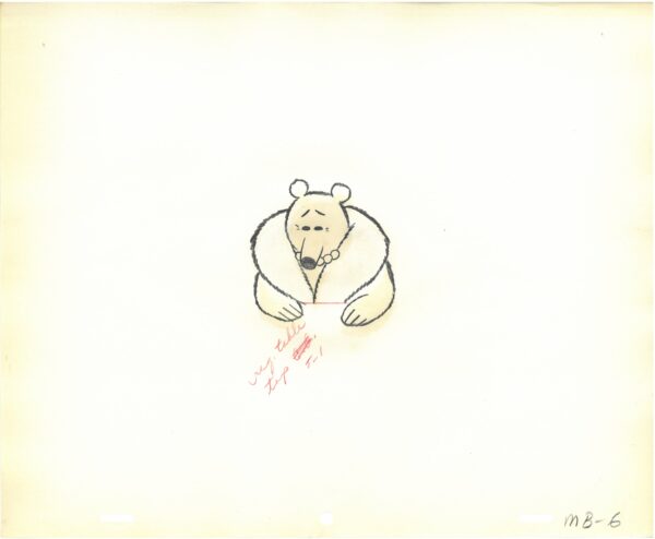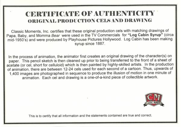 Matted original production cels with matching drawings of Papa, Baby, and Momma Bear were used in the TV Commercials for “Log Cabin Syrup” (circa mid-1950’s) and were produced by Playhouse Pictures Hollywood. Log Cabin has been making syrup since 1887. Produced by Playhouse Pictures Hollywood, created by cartoonist and animator Scott Shaw. Playhouse Pictures, founded in the 1950’s produced many well-known animation commercials, promotions and TV Openings, such as Hee-Haw, Rice Krispies, and Playboy. Includes COA Presented matted – 11×14