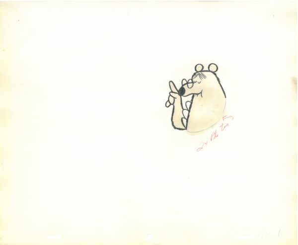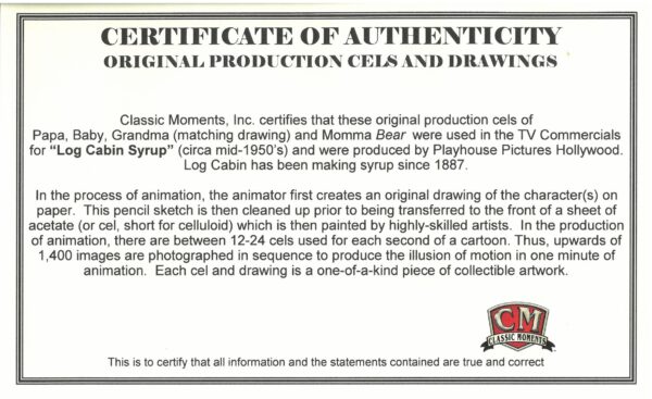 Matted original production cels with matching drawings of Papa, Baby, Grandma and Momma Bear were used in the TV Commercials for “Log Cabin Syrup” (circa mid-1950’s) and were produced by Playhouse Pictures Hollywood. Log Cabin has been making syrup since 1887. Produced by Playhouse Pictures Hollywood, created by cartoonist and animator Scott Shaw. Playhouse Pictures, founded in the 1950’s produced many well-known animation commercials, promotions and TV Openings, such as Hee-Haw, Rice Krispies, and Playboy. Includes COA Presented matted – 11×14