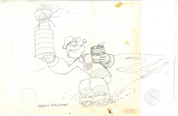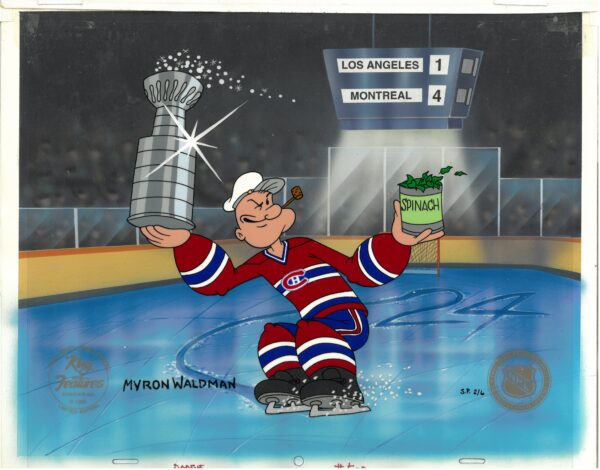 Canadiens 24th with Popeye. This SIGNED hand-painted limited-edition cel with SIGNED matching drawing was created by deceased Animation Director, Myron Waldman; Waldman was best known for his work at Fleischer Studio, where he started his first career work in 1930; At Fleischer, he worked on Betty Boop, Raggedy Ann, Gulliver’s Travels, Superman and Popeye cartoons; This cel is registered to the MASTER hand-painted background. COA. Presented sleeved – 10.5 x 12.5   Numbered S.P. 2/6 Licensed, features both the King Features and the NHL Logo Seals.