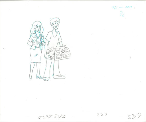 2 original 12-field production drawings from the Hanna-Barbera 13-episode series “The Thirteen Ghosts of Scooby-Doo.” Featured are the characters Shaggy and Daphne. Production notes can be found on the bottom of the drawings. Presented sleeved with a COA from Classic Moments.