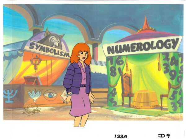 An original 12-field production cel with Hanna-Barbera Seal from the 13-episode series “The Thirteen Ghosts of Scooby-Doo.” Featured is the character Daphne. Production notes can be found on the bottom of the cel. Cel is registered to a lithograph background. Presented sleeved with a COA from Classic Moments.