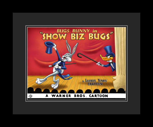 This framed limited edition 16×20 giclee lobby card entitled “Show Biz Bugs,” was released in 1957. “Show Biz Bugs” stars Bugs Bunny and Daffy Duck as its main characters. Show Biz Bugs is notable for portraying the modern interpretation of Daffy in a more sympathetic light: In this film, Daffy is a jealous and arrogant competitor to Bugs, but his shabby treatment by the theater management and audience is depicted as being unfairly out of proportion to the genuine talent he possesses. This edition is limited to 500 hand-numbered pieces. Originally, “Lobby Cards” were created to publicize each cartoon and were used by theater owners to display in theater lobbies. “Giclée,” as a fine art term, has come to be associated with prints using fade-resistant “archival” inks (including solvent inks) and the inkjet printers that use them.