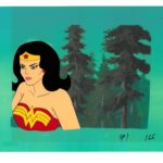 12-field original production cel of Wonder Woman. This cel was used in the Hanna-Barbera Production of “Super Friends” animated series (1985) featuring Superman and Wonder Woman. Cel is registered to a lithograph background. Presented sleeved with COA.